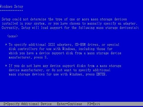 3. 按完"F6",后,安装程序会继续加载模块。这是正常的。过一会儿后,您将会看到以下信息:Setup could not determine the type of one or more mass storage devices installed in your system,