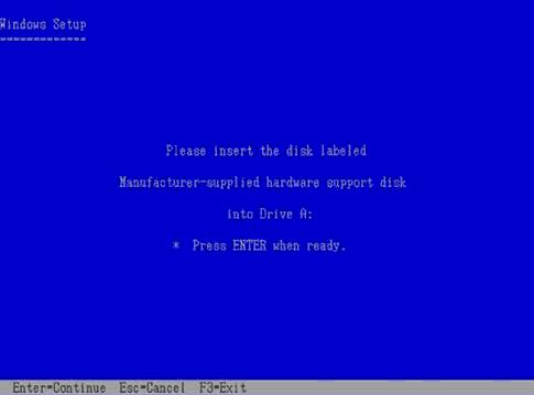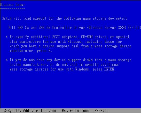 2. 在屏幕的底部出现信息:Press F6 if you need to install a third party SCSI or RAID driver 时,按"F6"键。